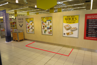 Prodejní plocha při vstupu do prodejny Albert. Vhodná pouze pro stánky do 1m hloubky.